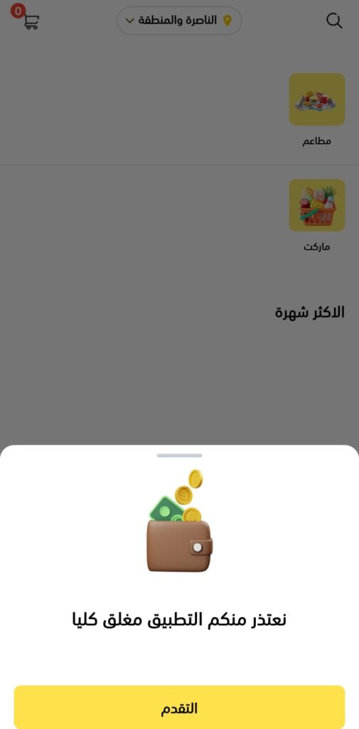 “نعتذر منكم التطبيق مغلق كليًا”- صورة شاشة للتطبيق