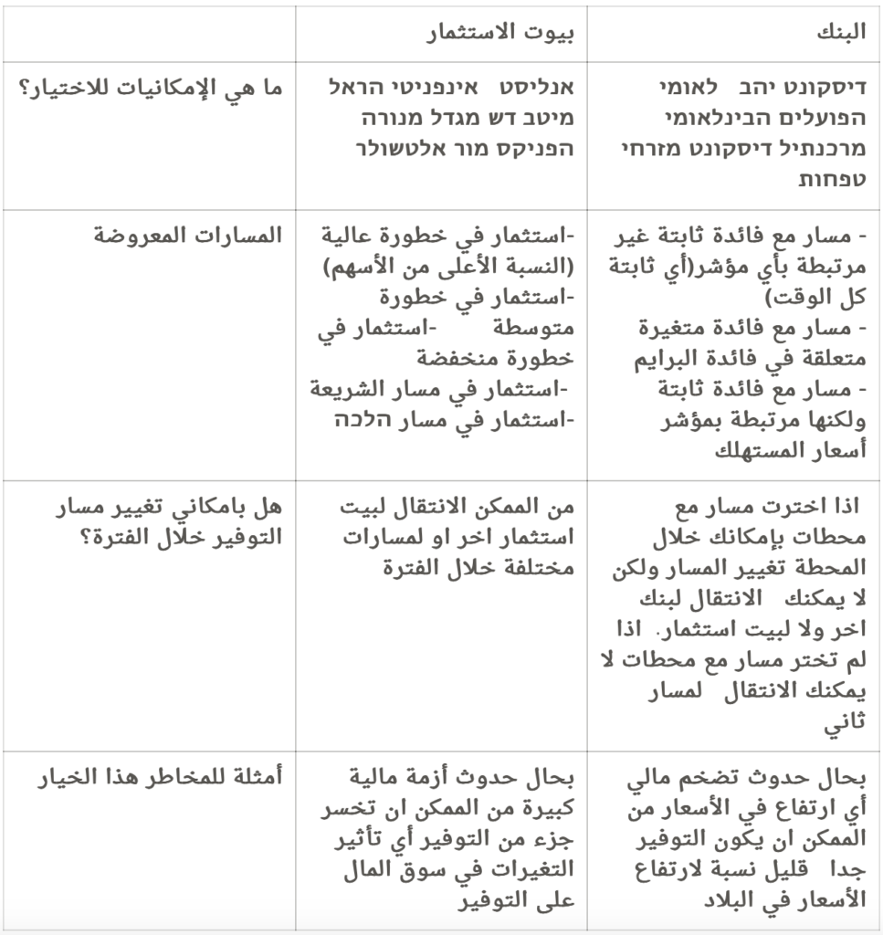 التوفير من خلال بيوت الاستثمار يعني استثمار الأموال في سوق المال عن طريق شراء أسهم وسندات دين لشركات وحكومات، أي أنّ الأموال مستثمرة في البورصة. التوفير في البنك هو مثل أي توفير عادي يكون في البنك مع المسارات الخاصة لهذا البرنامج.