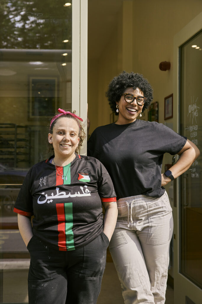 سارة: 100%. كان الأمر رائعًا. شارك الناس وكتبوا عن أهمية هذا العمل الآن. يأتون إلى الباب يريدون إظهار تضامنهم. نقوم بتوزيع ملصقات عيها بطيخ صغير مع الكوفية، وقد وزعنا الآلاف منها لأن الناس يريدون إظهار دعمهم. لقد تم التجاوب مع جهودنا لجمع التبرعات بشكل جيد. يأتي الناس دون معرفة المخبز لكنهم ينجذبون إليه لأنه فلسطيني. و لم نتلق أي ردود فعل سلبية حتى الآن.