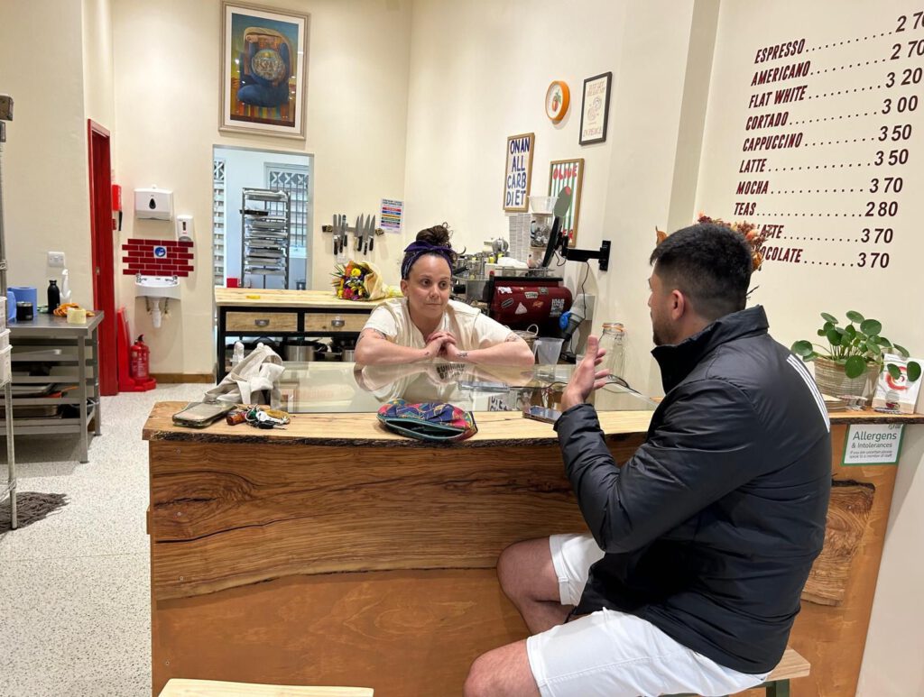 سارة: أنا سارة بريطانية فلسطينية. الآن أعرّف نفسي أكثر كمالكة لمخبز، وكامرأة فلسطينية. نعم، لقد افتتحنا هذا المخبز مؤخرًا، والذي تصفه والدتي الفلسطينية التي ولدت في مدينة القدس بأنه يشبه مخبز “رأس البون”. لديه سحر كونه منتج فلسطيني بريطاني. لذا، أعتقد أنني لا أشعر بالارتباط الكبير بكوني من بريطانيا، ولكنني أشعر بالارتباط الكبير بكوني من جنوب لندن. لذا سأقول إنني، مثلًا، فلسطينية من جنوب لندن.