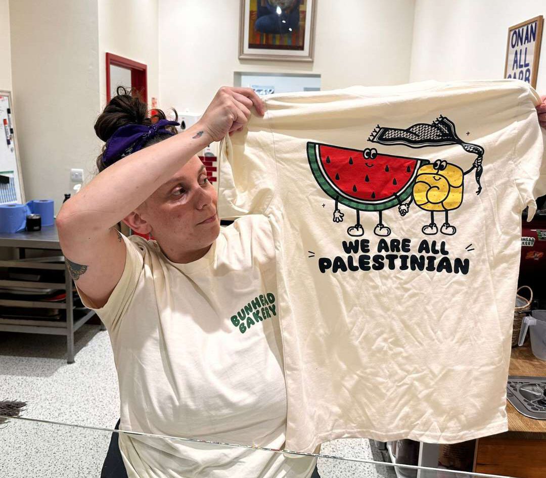 سارة: 100%. كان الأمر رائعًا. شارك الناس وكتبوا عن أهمية هذا العمل الآن. يأتون إلى الباب يريدون إظهار تضامنهم. نقوم بتوزيع ملصقات عيها بطيخ صغير مع الكوفية، وقد وزعنا الآلاف منها لأن الناس يريدون إظهار دعمهم. لقد تم التجاوب مع جهودنا لجمع التبرعات بشكل جيد. يأتي الناس دون معرفة المخبز لكنهم ينجذبون إليه لأنه فلسطيني. و لم نتلق أي ردود فعل سلبية حتى الآن.