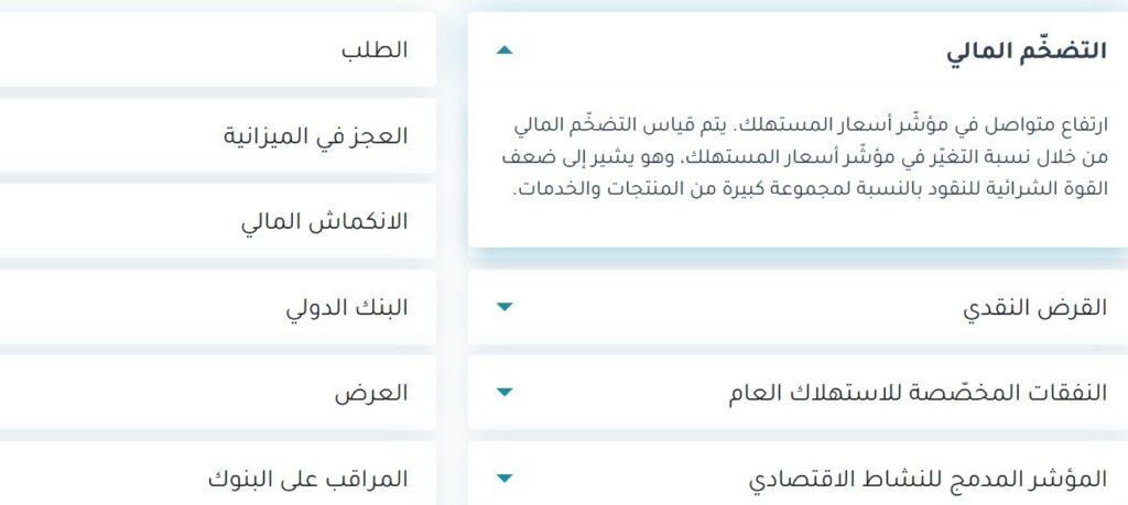 تتضمن الصفحة مجموعة واسعة من المصطلحات الاقتصادية الهامة، مثل التضخم، سعر الفائدة، الناتج المحلي الإجمالي، النمو الاقتصادي، المؤشر المُدمَج وغيرها. ويُرافق كل مصطلح شرح واضح ومفصّل يهدف إلى تسهيل فهم القرّاء للمفاهيم الاقتصادية، سواء الأساسية منها أو المعقدة. الهدف من ذلك هو تزويد كل فرد بالأدوات اللازمة لفهم العالم المالي، وبالتالي المساعدة في اتخاذ قرارات اقتصادية أكثر وعيًا.
