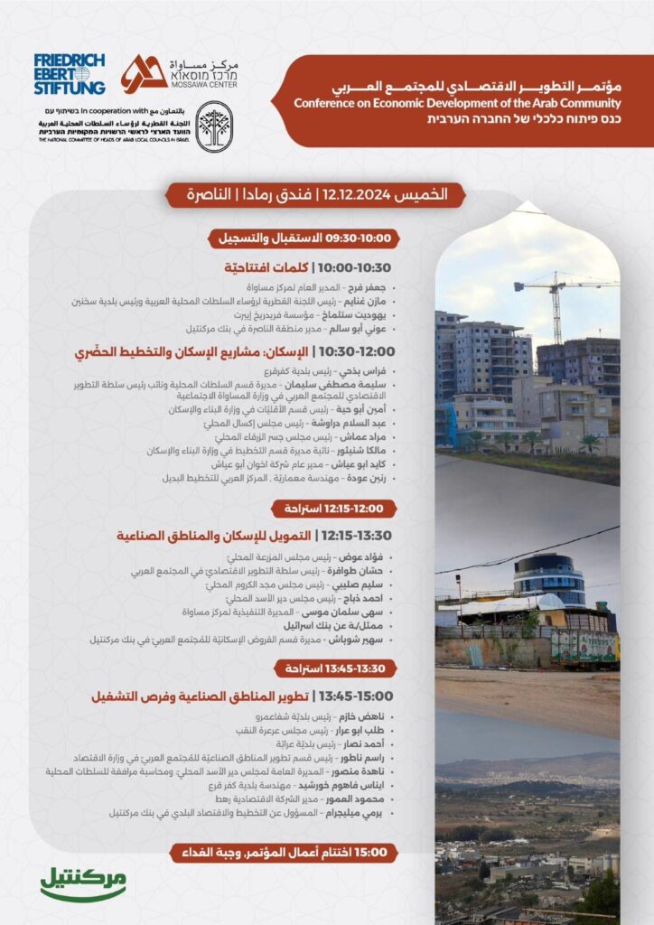 في يوم الخميس 12 ديسمبر 2024، يُنظم مركز “مساواة” مؤتمر التطوير الاقتصادي والإسكان في المجتمع العربي بمدينة الناصرة. سيركز المؤتمر على قضايا الصناعة، الإسكان، والتمويل، مع تخصيص جلسات لبحث سياسات الحكومة المتعلقة بتمويل وتخطيط المناطق الصناعية في البلدات العربية. سيناقش المؤتمر أيضًا جهود السلطات المحلية للحصول على جزء من إيرادات المناطق الصناعية القريبة، إلى جانب معيقات التخطيط، ودور القطاع الخاص في تطوير وتمويل المناطق الصناعية والتجارية.